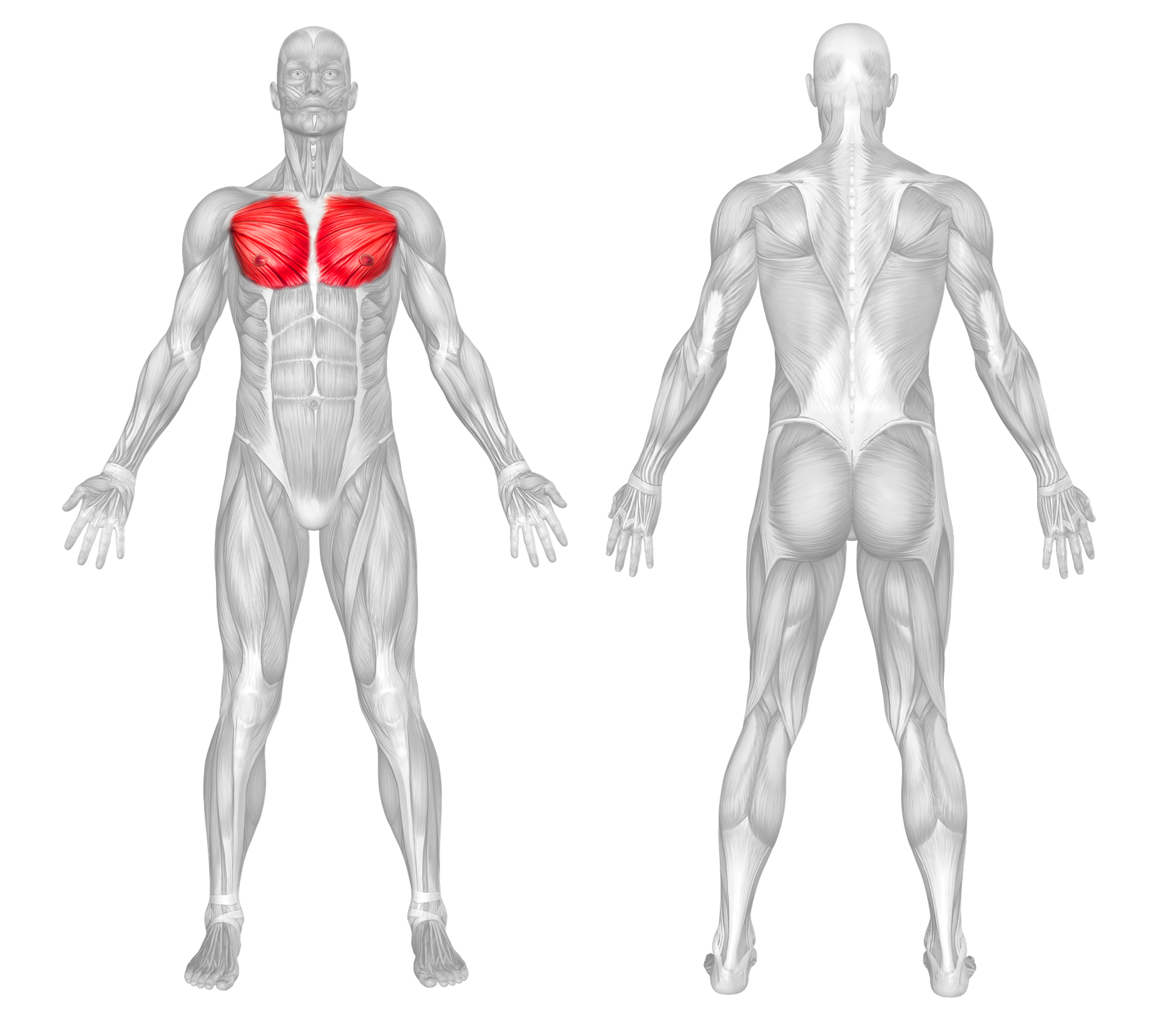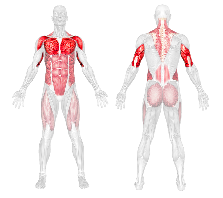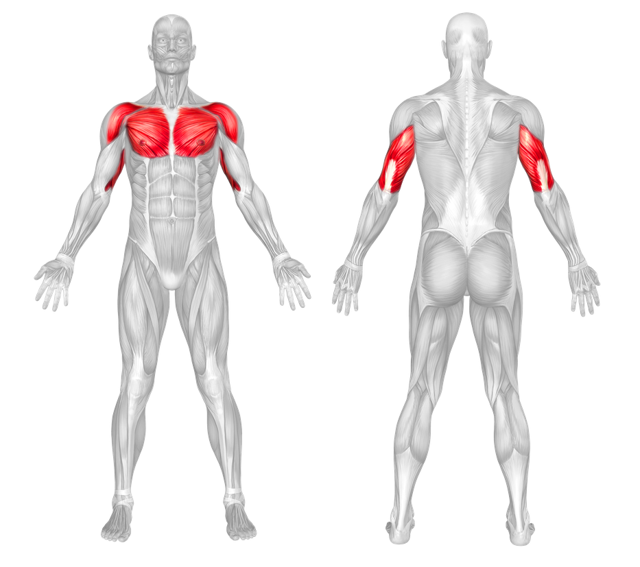 Primary: Chest (pectorals), Shoulders (deltoids), Triceps