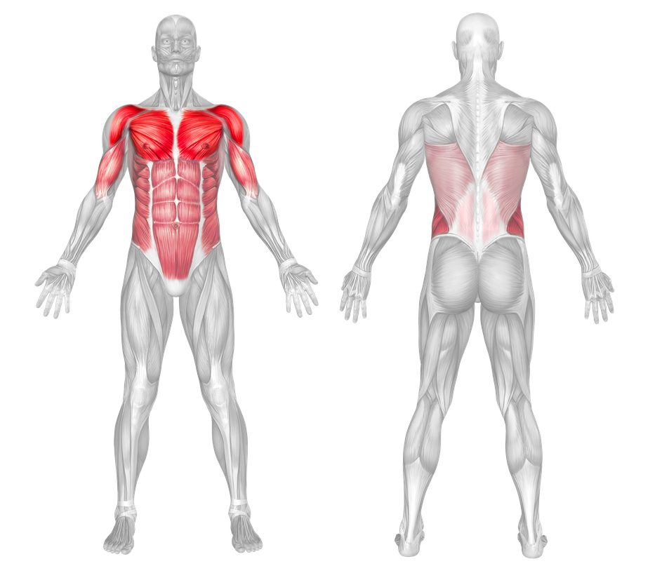 Secondary: Core (abdominals, obliques), Back (seratus anterior, traps, rhomboids)